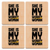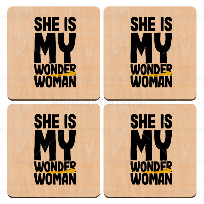 She is my wonder woman, ΣΕΤ x4 Σουβέρ ξύλινα τετράγωνα plywood (9cm)