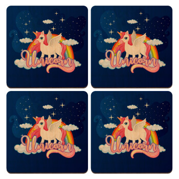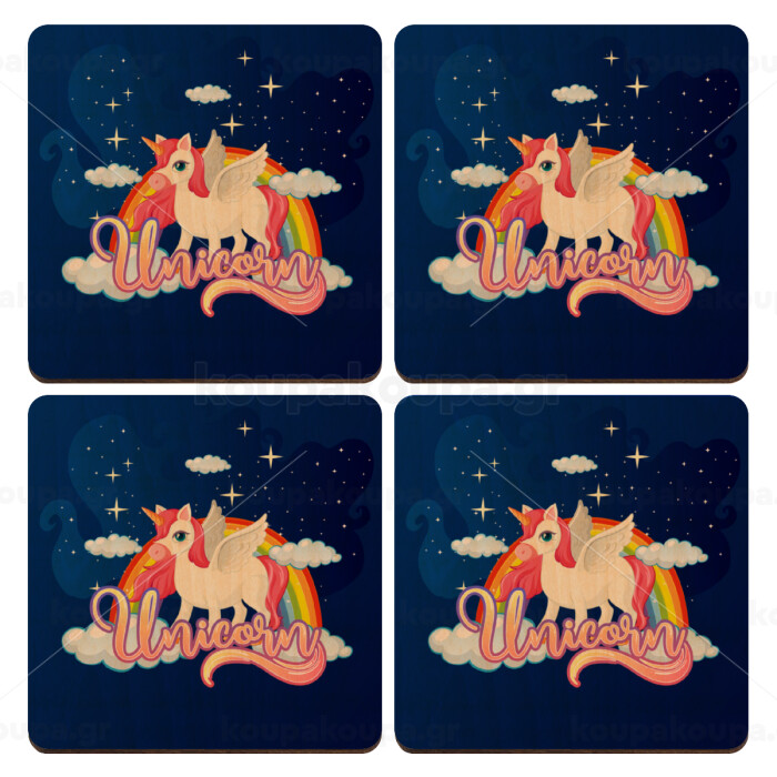 Μονόκερος, ΣΕΤ x4 Σουβέρ ξύλινα τετράγωνα plywood (9cm)