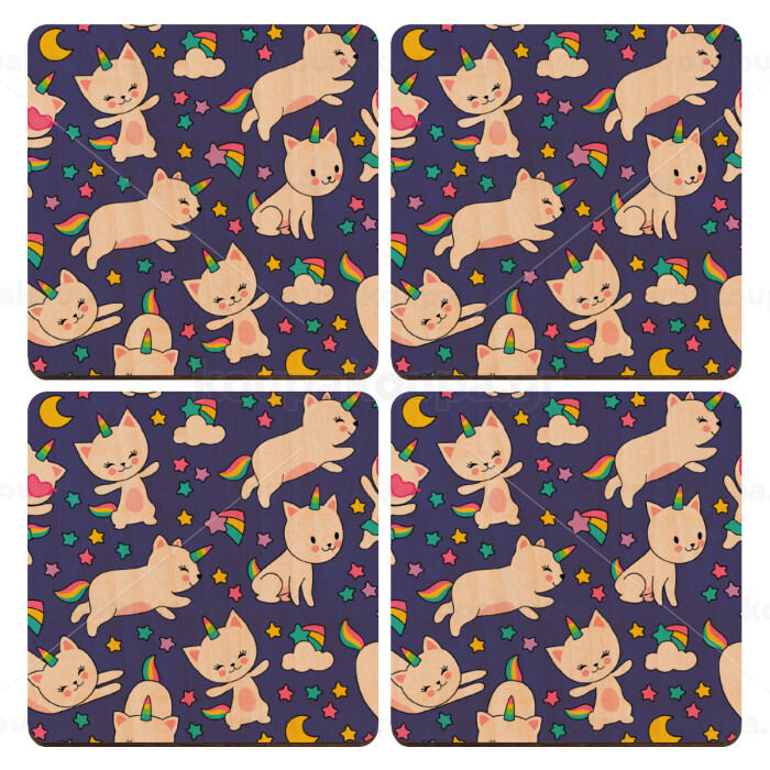 Cats unicorns, ΣΕΤ x4 Σουβέρ ξύλινα τετράγωνα plywood (9cm)