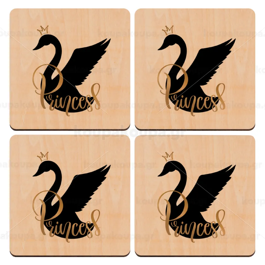Swan Princess, ΣΕΤ x4 Σουβέρ ξύλινα τετράγωνα plywood (9cm)