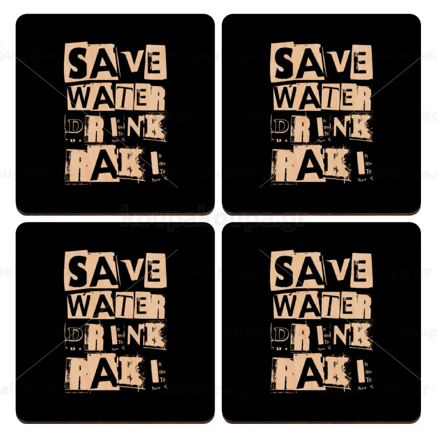 Save Water, Drink RAKI, ΣΕΤ x4 Σουβέρ ξύλινα τετράγωνα plywood (9cm)