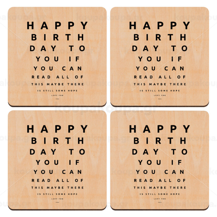 EYE tester happy birthday., ΣΕΤ x4 Σουβέρ ξύλινα τετράγωνα plywood (9cm)