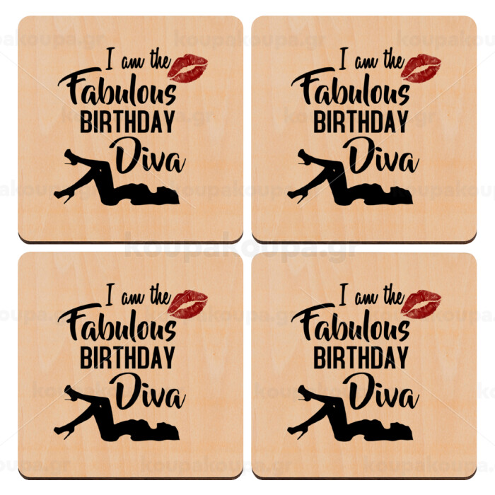 I am the fabulous Birthday Diva, ΣΕΤ x4 Σουβέρ ξύλινα τετράγωνα plywood (9cm)