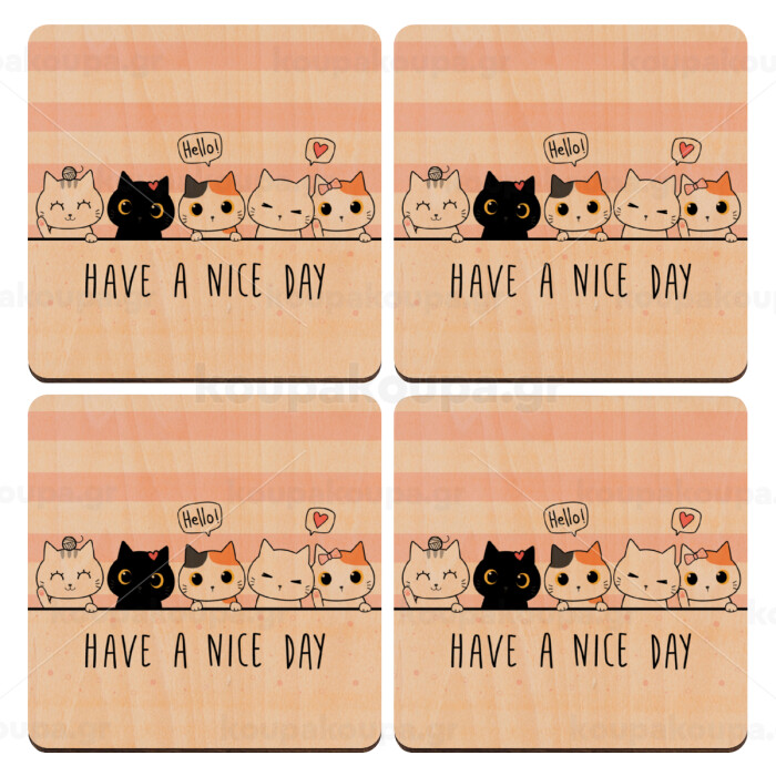 Have a nice day cats, ΣΕΤ x4 Σουβέρ ξύλινα τετράγωνα plywood (9cm)