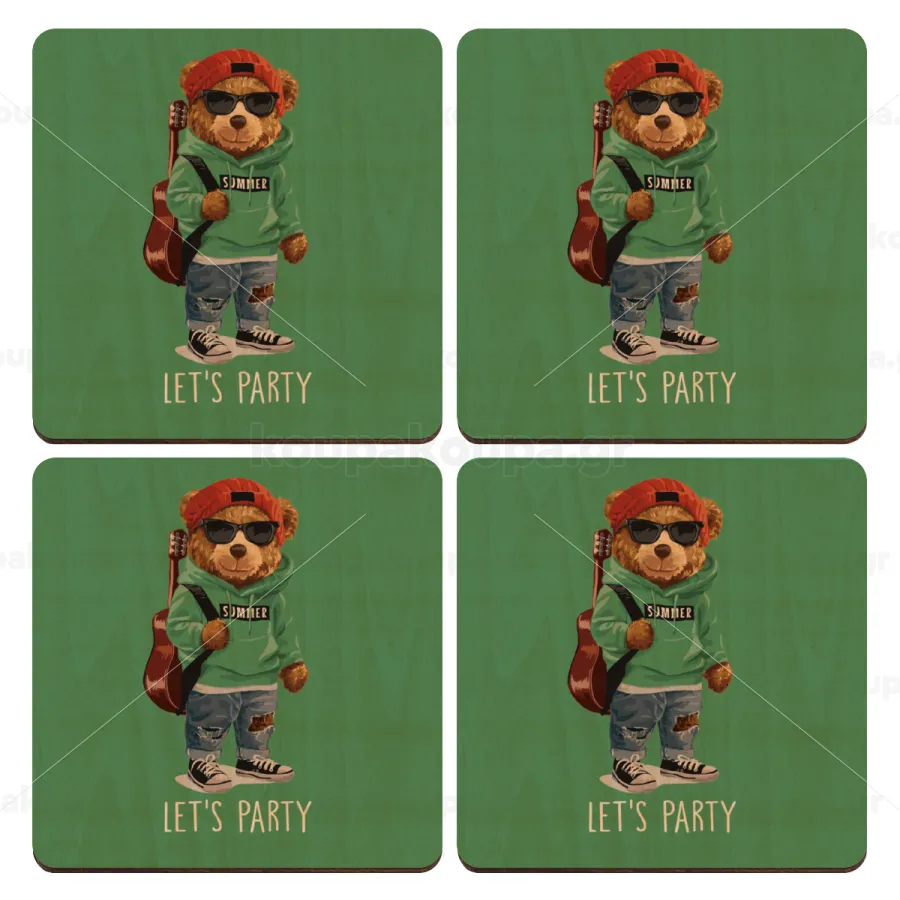 Let's Party Bear, ΣΕΤ x4 Σουβέρ ξύλινα τετράγωνα plywood (9cm)