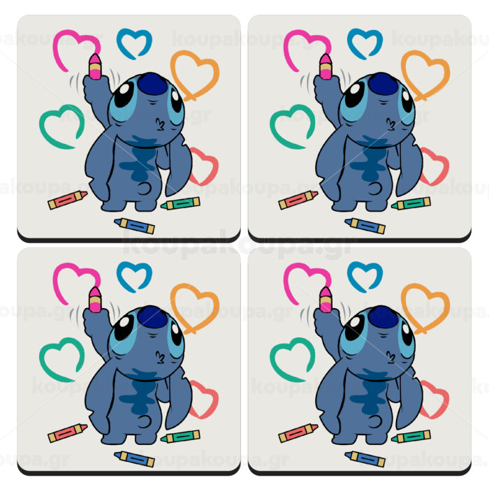 Lilo & Stitch painting, ΣΕΤ 4 Σουβέρ ξύλινα τετράγωνα (9cm)