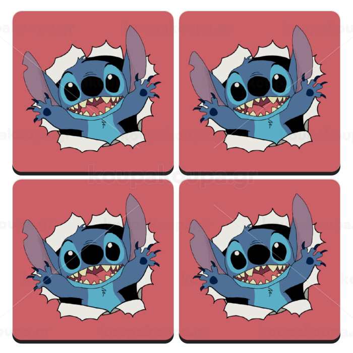 Stitch hello!!!, ΣΕΤ 4 Σουβέρ ξύλινα τετράγωνα (9cm)