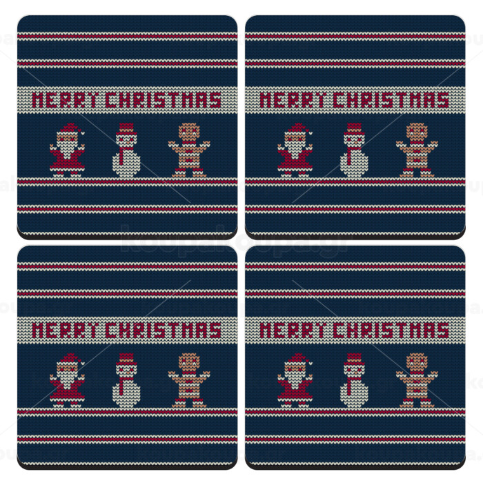 Merry christmas knitted, ΣΕΤ 4 Σουβέρ ξύλινα τετράγωνα (9cm)