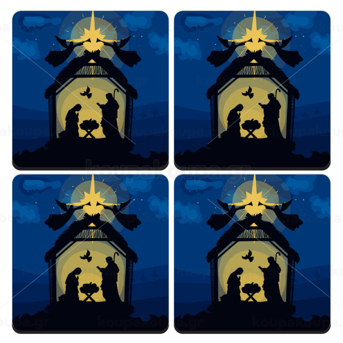 Η γέννηση του Ιησού φάτνη, ΣΕΤ 4 Σουβέρ ξύλινα τετράγωνα (9cm)