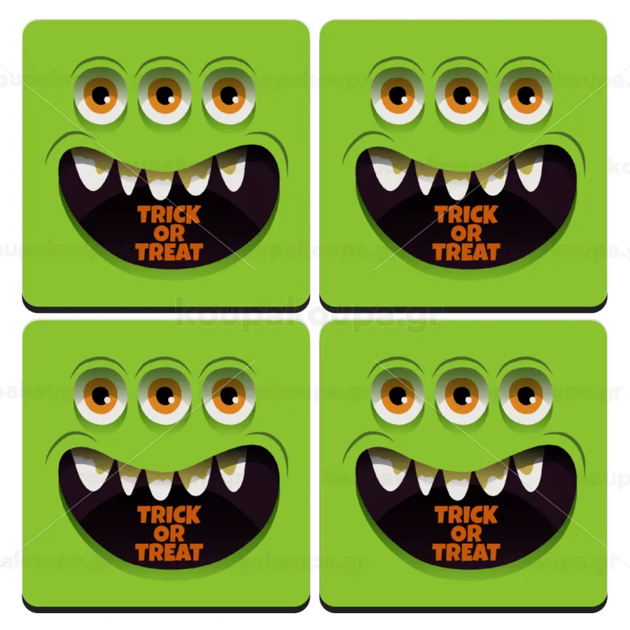 Halloween trick or treat 3 eyes monster, ΣΕΤ 4 Σουβέρ ξύλινα τετράγωνα (9cm)