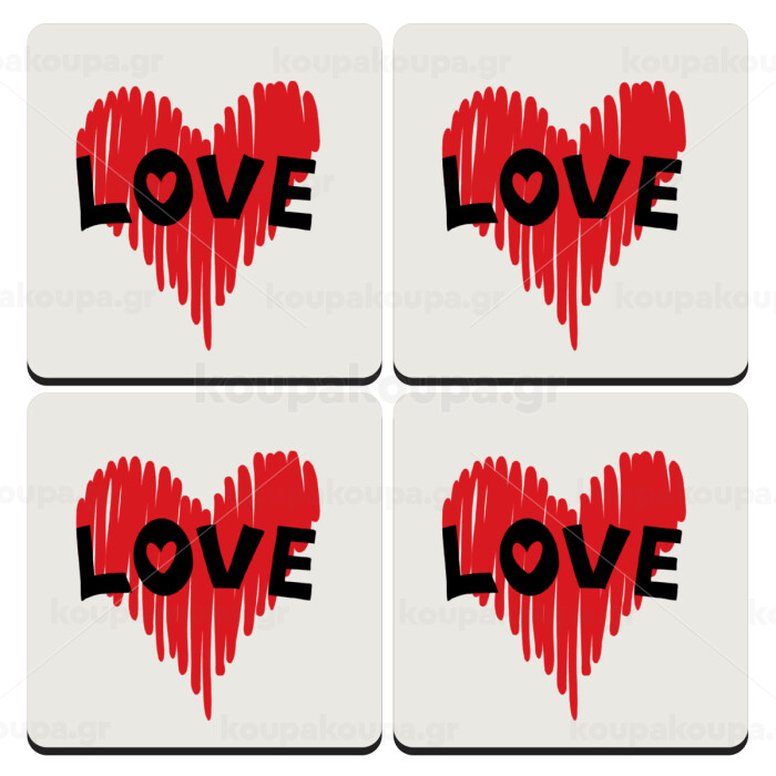 I Love You red heart, ΣΕΤ 4 Σουβέρ ξύλινα τετράγωνα (9cm)