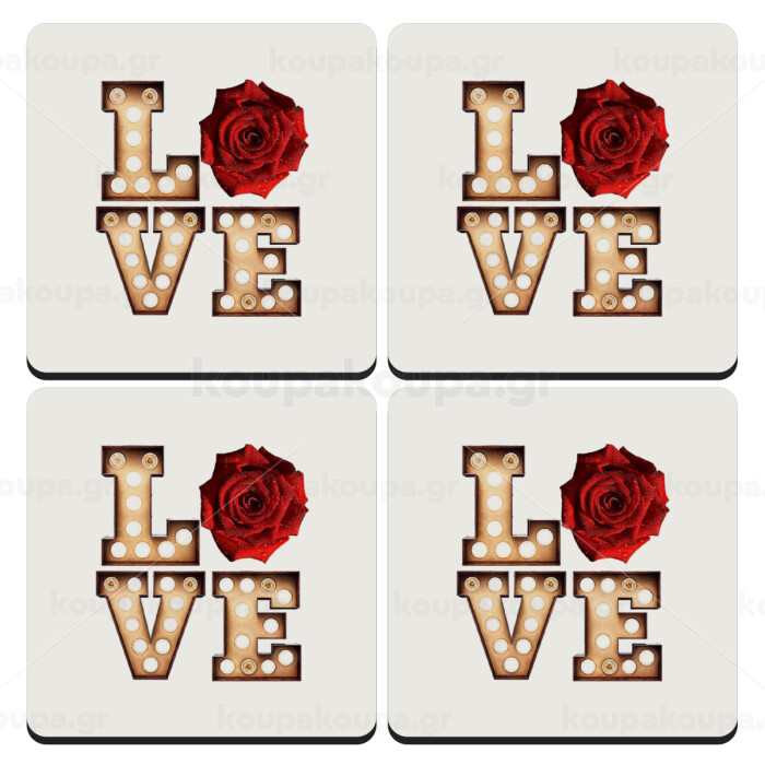Love lights and roses, ΣΕΤ 4 Σουβέρ ξύλινα τετράγωνα (9cm)