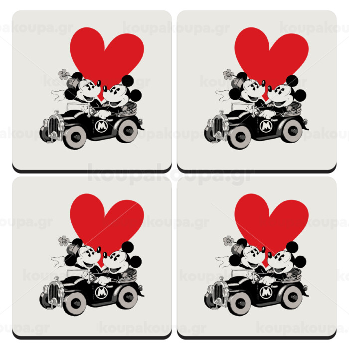 Mickey & Minnie love car, ΣΕΤ 4 Σουβέρ ξύλινα τετράγωνα (9cm)