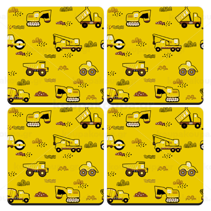 Αμαξάκια φορτωτές και μπουλντόζες, ΣΕΤ 4 Σουβέρ ξύλινα τετράγωνα (9cm)
