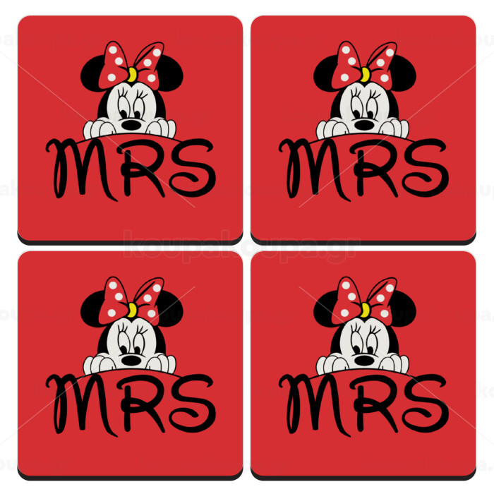 Minnie Mrs, ΣΕΤ 4 Σουβέρ ξύλινα τετράγωνα (9cm)