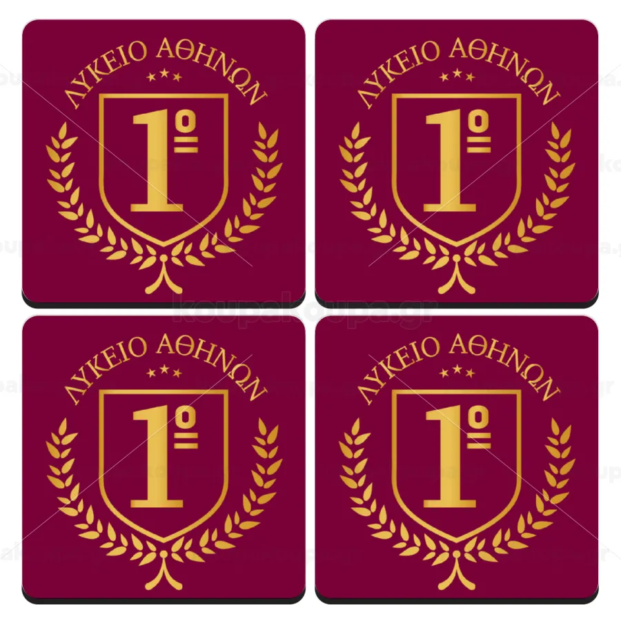 Έμβλημα Σχολικό μπορντό, ΣΕΤ 4 Σουβέρ ξύλινα τετράγωνα (9cm)