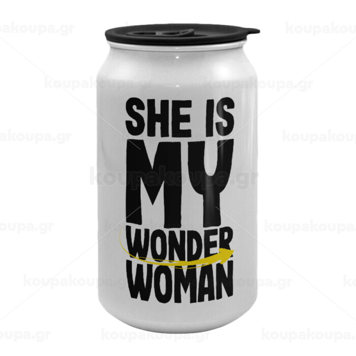 She is my wonder woman, Κούπα ταξιδιού μεταλλική με καπάκι (tin-can) 500ml