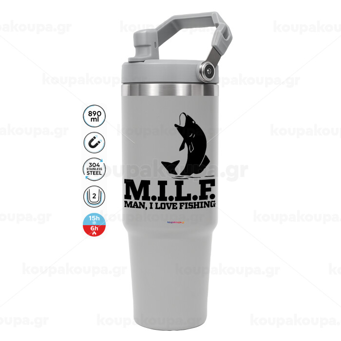 M.I.L.F. Mam i love fishing, ΓΚΡΙ χρώματος Θερμός Ανοξείδωτο 890ml (30oz) με χερούλι
