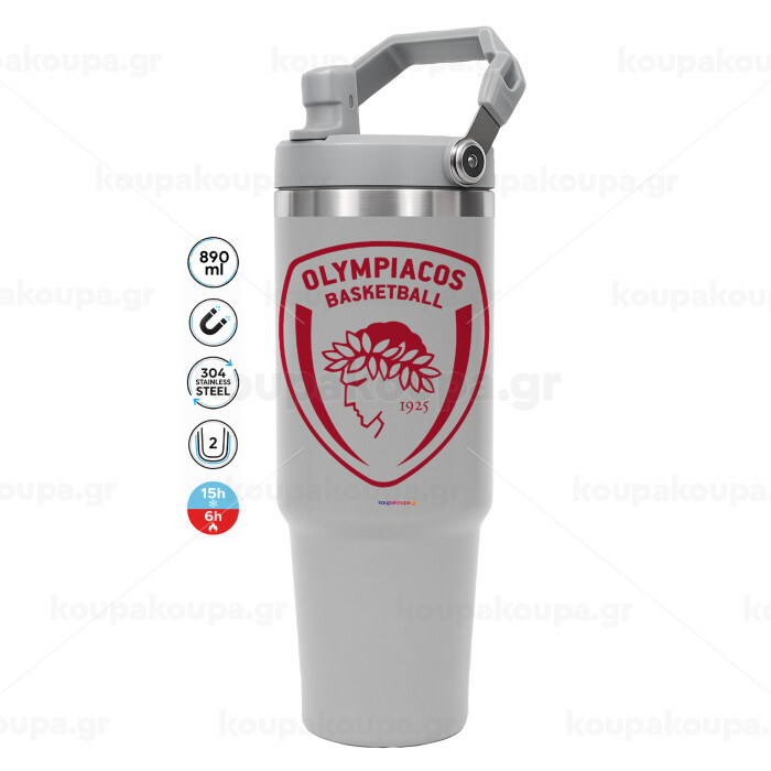 Olympiacos B.C., ΓΚΡΙ χρώματος Θερμός Ανοξείδωτο 890ml (30oz) με χερούλι