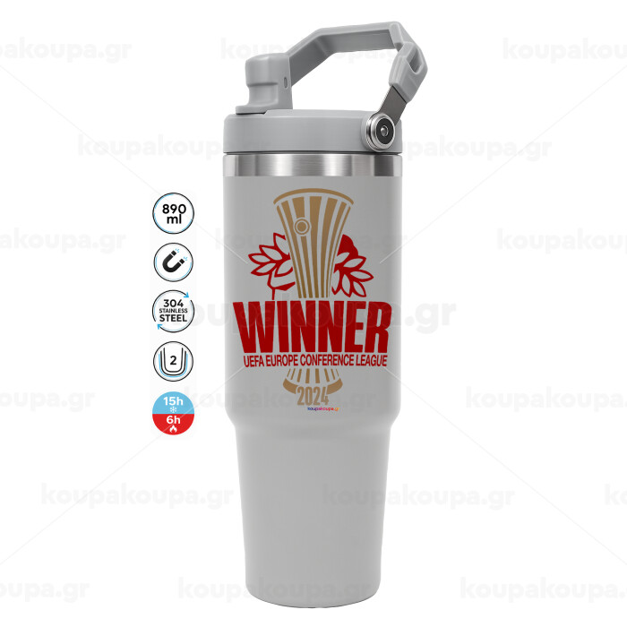 Europa Conference League WINNER, ΓΚΡΙ χρώματος Θερμός Ανοξείδωτο 890ml (30oz) με χερούλι