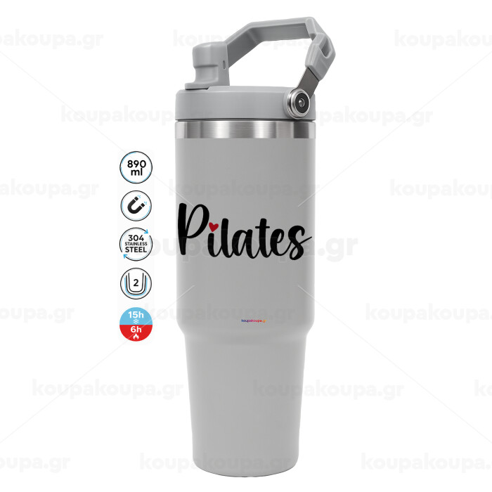 Pilates love, ΓΚΡΙ χρώματος Θερμός Ανοξείδωτο 890ml (30oz) με χερούλι