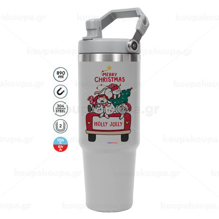 Merry Christmas cats in car, ΓΚΡΙ χρώματος Θερμός Ανοξείδωτο 890ml (30oz) με χερούλι