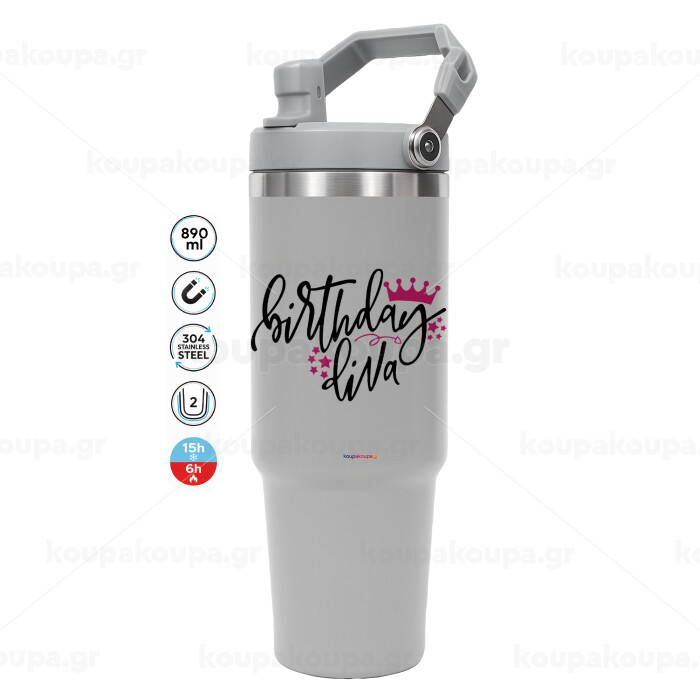 Birthday Diva queen, ΓΚΡΙ χρώματος Θερμός Ανοξείδωτο 890ml (30oz) με χερούλι