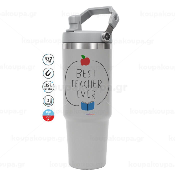 Best teacher ever, ΓΚΡΙ χρώματος Θερμός Ανοξείδωτο 890ml (30oz) με χερούλι