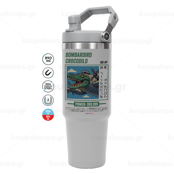 Bombardiro Crocodilo, ΓΚΡΙ χρώματος Θερμός Ανοξείδωτο 890ml (30oz) με χερούλι