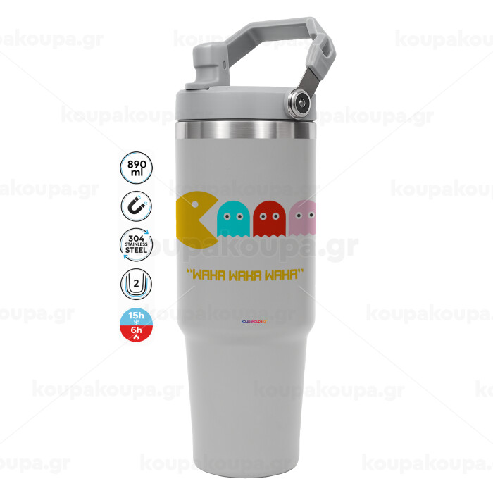 Pacman waka waka waka, ΓΚΡΙ χρώματος Θερμός Ανοξείδωτο 890ml (30oz) με χερούλι