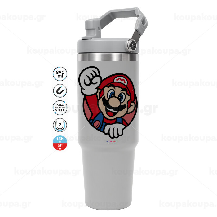 Super mario win, ΓΚΡΙ χρώματος Θερμός Ανοξείδωτο 890ml (30oz) με χερούλι
