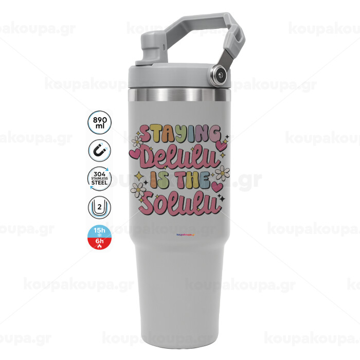 Delulu, ΓΚΡΙ χρώματος Θερμός Ανοξείδωτο 890ml (30oz) με χερούλι