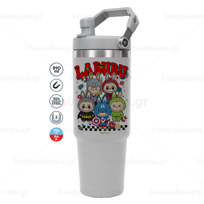 Labubu superheroes, ΓΚΡΙ χρώματος Θερμός Ανοξείδωτο 890ml (30oz) με χερούλι