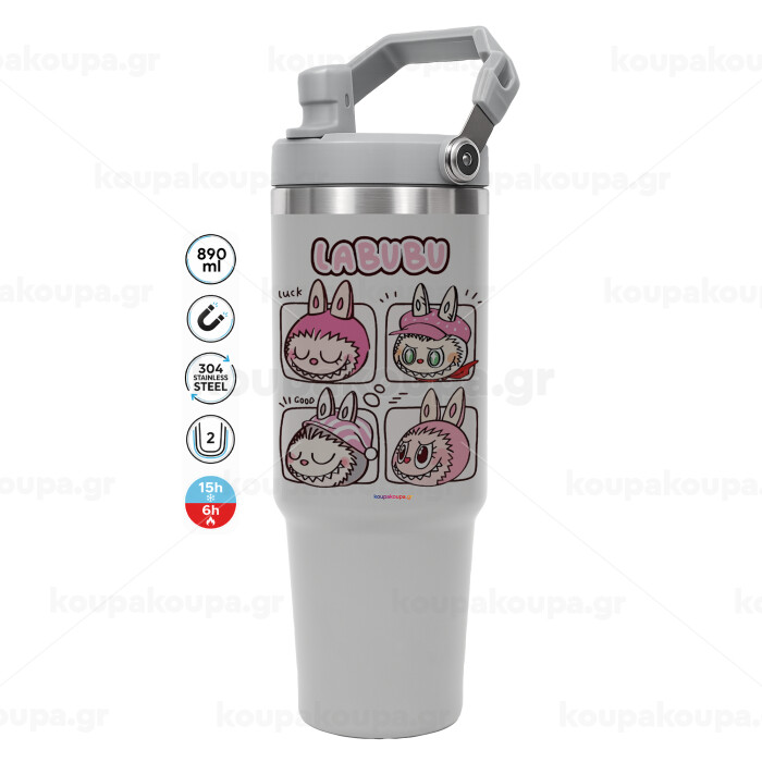 Labubu pink, ΓΚΡΙ χρώματος Θερμός Ανοξείδωτο 890ml (30oz) με χερούλι