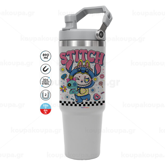 Labubu Stitch, ΓΚΡΙ χρώματος Θερμός Ανοξείδωτο 890ml (30oz) με χερούλι