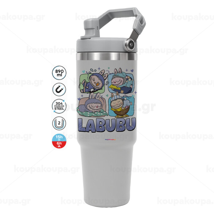 Labubu, ΓΚΡΙ χρώματος Θερμός Ανοξείδωτο 890ml (30oz) με χερούλι