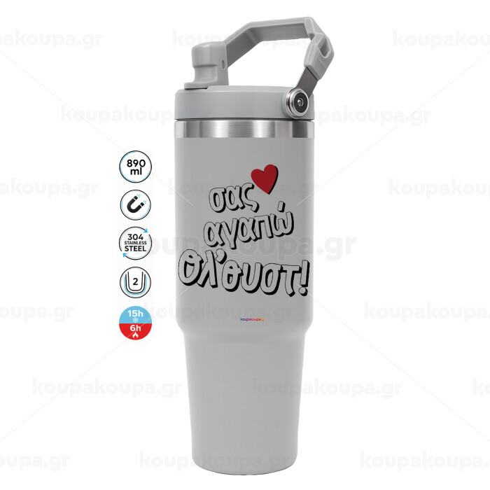 Σας αγαπώ όλ'ουστ!, ΓΚΡΙ χρώματος Θερμός Ανοξείδωτο 890ml (30oz) με χερούλι