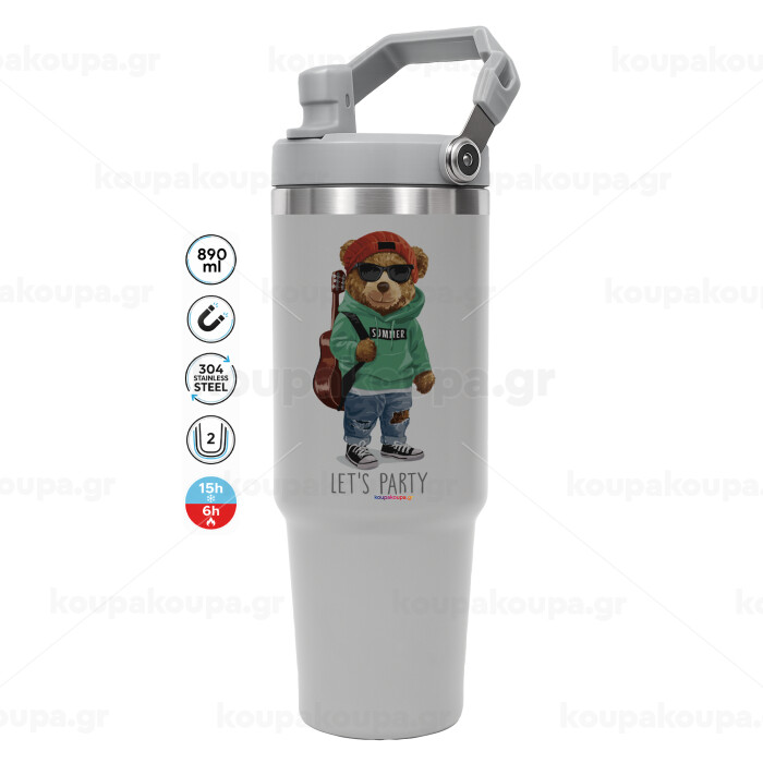 Let's Party Bear, ΓΚΡΙ χρώματος Θερμός Ανοξείδωτο 890ml (30oz) με χερούλι
