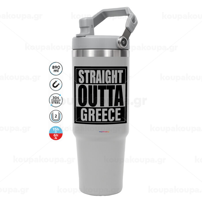 Straight Outta greece, ΓΚΡΙ χρώματος Θερμός Ανοξείδωτο 890ml (30oz) με χερούλι
