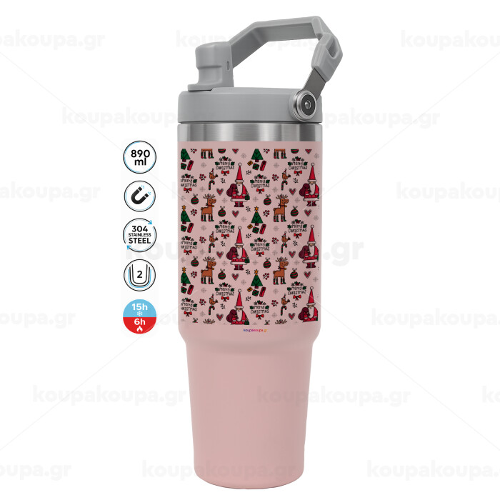 Santas, Deers & Trees, ΡΟΖ χρώματος Θερμός Ανοξείδωτο 890ml (30oz) με χερούλι