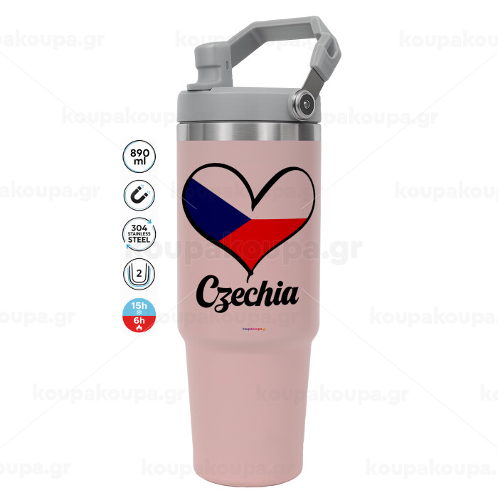 Czechia flag, ΡΟΖ Travel Tumbler Θερμός με χερούλι και καλαμάκι 890ml
