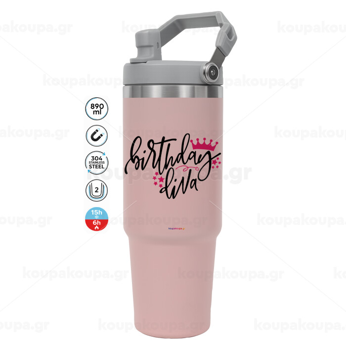 Birthday Diva queen, ΡΟΖ χρώματος Θερμός Ανοξείδωτο 890ml (30oz) με χερούλι