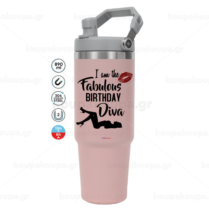 I am the fabulous Birthday Diva, ΡΟΖ χρώματος Θερμός Ανοξείδωτο 890ml (30oz) με χερούλι