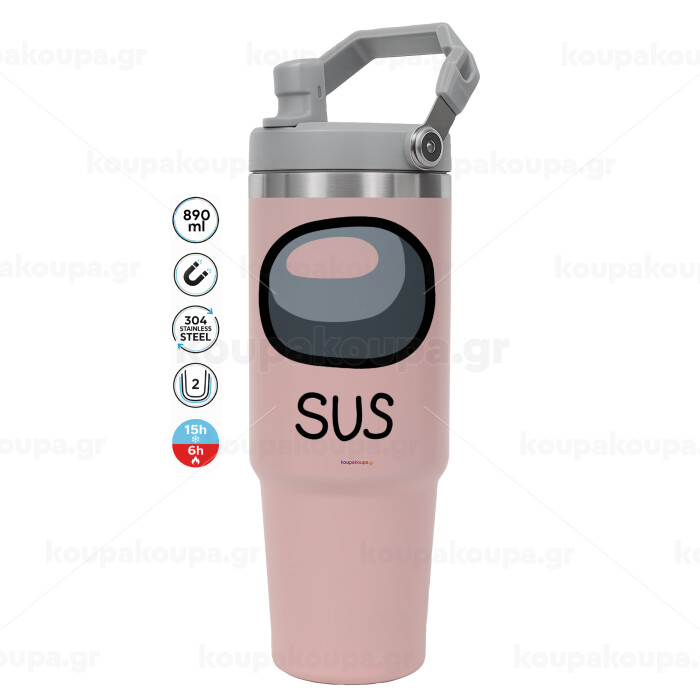 Among US SUS!!!, ΡΟΖ χρώματος Θερμός Ανοξείδωτο 890ml (30oz) με χερούλι
