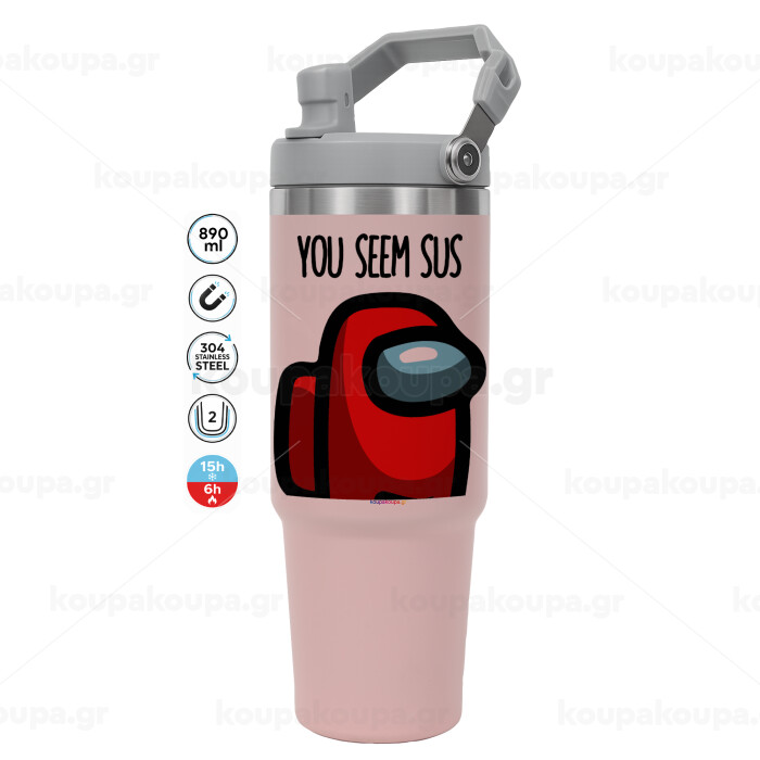 Among US, you seem sus, ΡΟΖ χρώματος Θερμός Ανοξείδωτο 890ml (30oz) με χερούλι