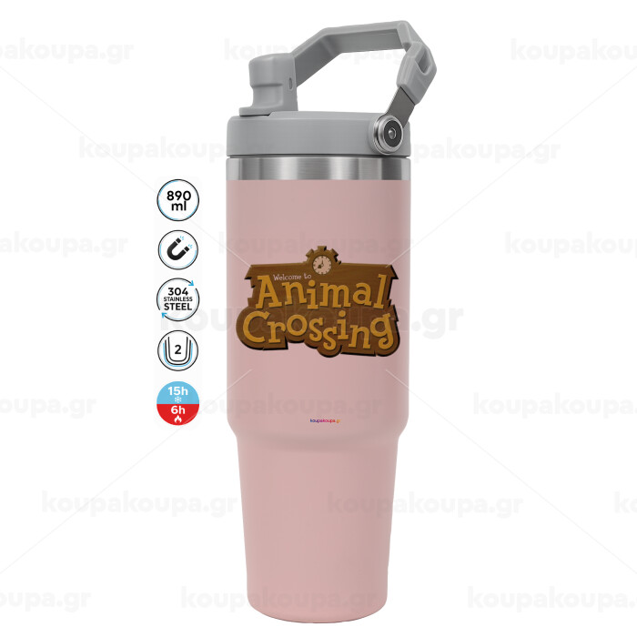 Animal Crossing, ΡΟΖ χρώματος Θερμός Ανοξείδωτο 890ml (30oz) με χερούλι