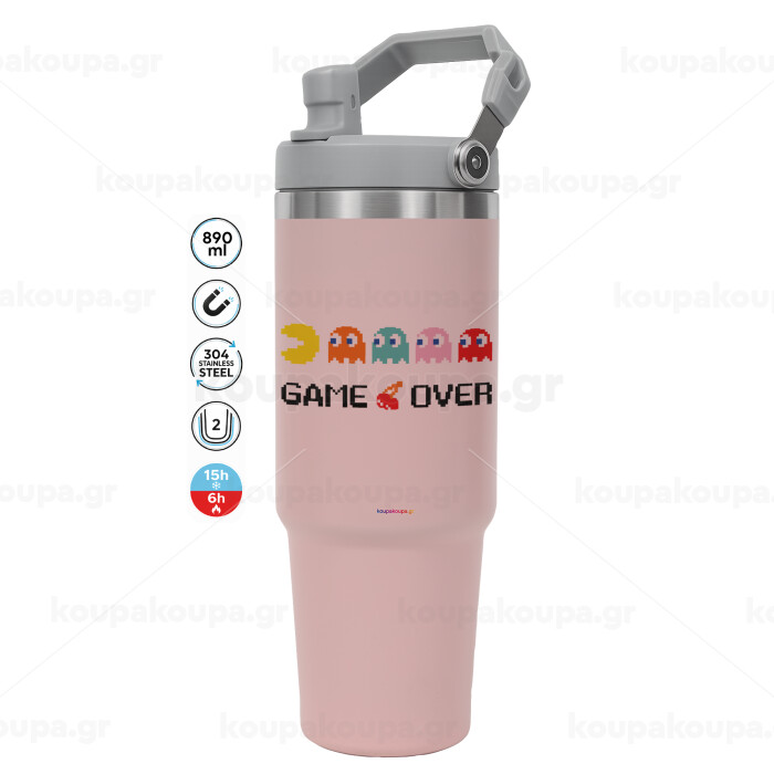 GAME OVER pac-man, ΡΟΖ χρώματος Θερμός Ανοξείδωτο 890ml (30oz) με χερούλι