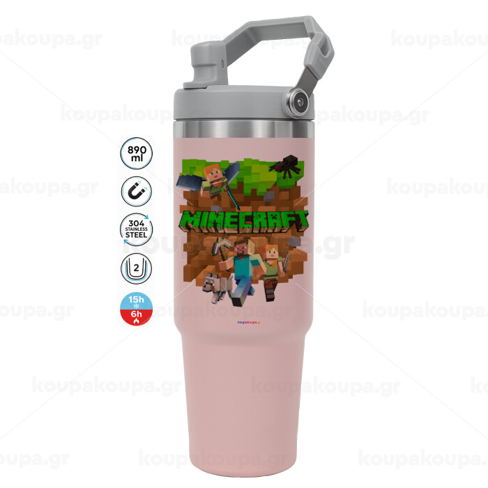 Minecraft characters, ΡΟΖ χρώματος Θερμός Ανοξείδωτο 890ml (30oz) με χερούλι