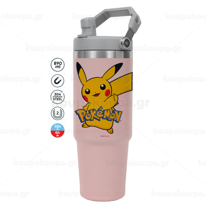 Pokemon pikachu, ΡΟΖ χρώματος Θερμός Ανοξείδωτο 890ml (30oz) με χερούλι