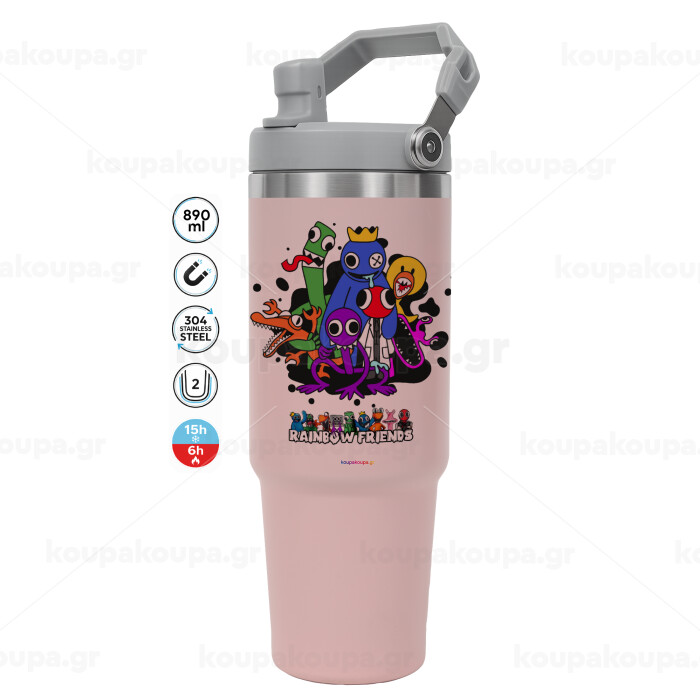 Rainbow friends, ΡΟΖ χρώματος Θερμός Ανοξείδωτο 890ml (30oz) με χερούλι
